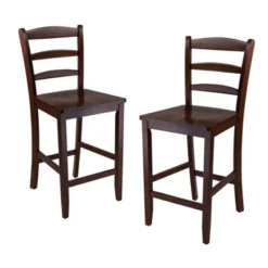 The Albany 3-piece High Table and Counter Stool Set combines the warmth of natural wood grain with a classic and practical approach to small space dining and storage. The table offers a wide and substantial tabletop with wrap-around aprons. The two shelves are a handy spot for keeping the serveware or decorative pieces you’d like to show off. The large cabinet with two doors is just the place for glassware, dishes, and small appliances. Each of the cabinet doors is finished with a sleek pull handle in a matte silver finish. This set is ideal for smaller spaces in the kitchen or dining area where you can pull up the Solid Wood Ladder Back Stools for a meal or snack. The tabletop and legs are made of Solid Wood in a rich Walnut finish, as are the matching stools.