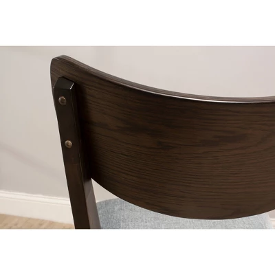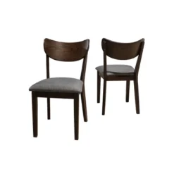 - Upholstered dining chairs feature a curved back and upholstered seat in a cool gray fabric