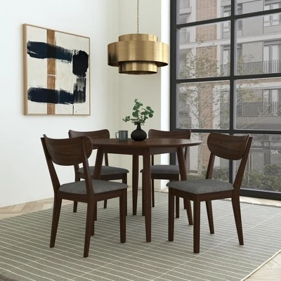 - Midcentury modern 5 piece round dining set in a warm chestnut finish