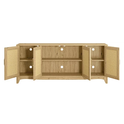 Introducing our stunning 70-inch TV stand, featuring a charming farmhouse-style design with fabric doors. Keep your audio and video cables organized and clean with the convenient cable management cutouts. The rustic ranch style of this TV stand will blend seamlessly with your current decor, elevating the look and feel of your living room. Add a touch of charm to your home entertainment setup with this beautiful piece.