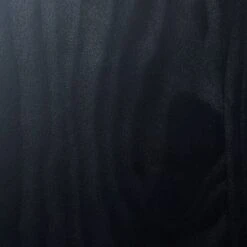 - Black wood console table has a lower rattan shelf for added interest