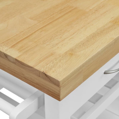 This versatile rolling cart is a great addition to any kitchen. It allows you to easily transport your dishes and utensils where you need them. Stunning yet simple with is cheery white storage shelves and butcher block table top, for a look that brightens up any room. Straight legs and clean lines add a timeless look that fits with any kitchen or dining room decor style.