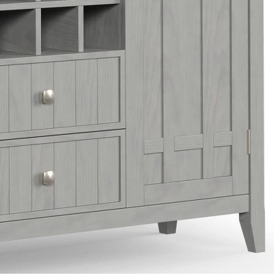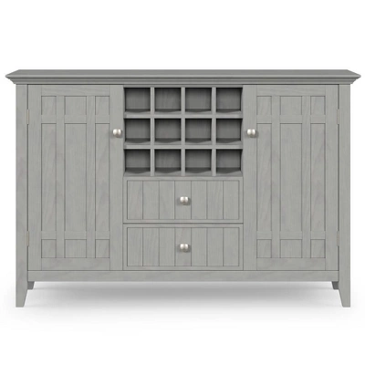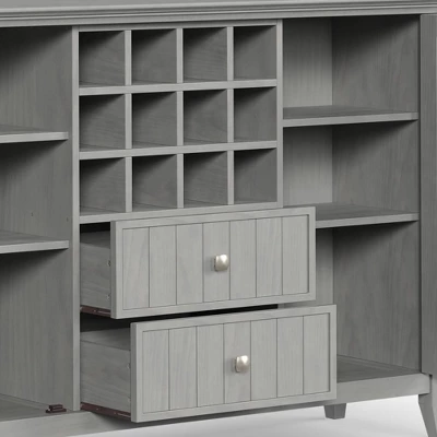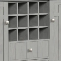 - Features two (2) central drawers with metal glides, two (2) side doors that open to large storage spaces with two (2) shelves each and a twelve (12) bottle wine storage rack.