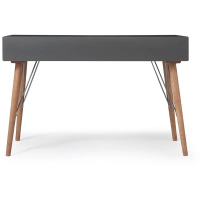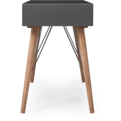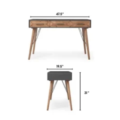 This high-quality desk console will add a sense of sophistication to your home office while also helping you keep your work organized. Three storage drawers make this the perfect versatile piece – whether you use it as a writing desk, entryway console, or chic vanity table. In a distinctive and contemporary style to complement your modern décor. A warm brown wood finish and sleek gray table top provide beauty and durability without overpowering your decor. The tapered wood legs of this piece finish off the look with a timeless sophistication.