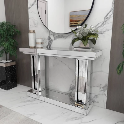 Bring a finishing touch to your home with an inviting appeal with this console table. A sturdy and long lasting construction for a years of enjoyment. Decorate this mirrored console table with a bouquet of fresh flowers and ceramic lamp for the perfect glam look. Designed with felt or rubber stoppers at the base that prevent scratching furniture and table tops, as well as sliding around. This item ships in 2 cartons. Reflective mirrors adorn the tabletop, legs, and base. Suitable for indoor use only. Some assembly required. Maximum weight limit is 100 lbs. This is a single silver colored entryway table. Glam style.