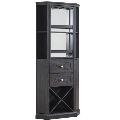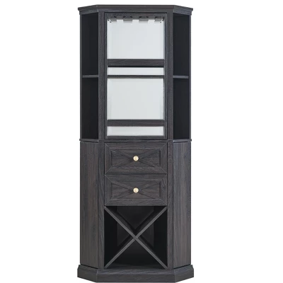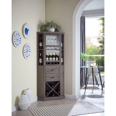 - Top shelf is rotated for choice to display wine bottles or stemware rack