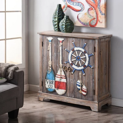 An attractive cabinet with coastal-inspired style, the Key West Chatham Cabinet from the Signature Collection by StyleCraft Home Collection is made of wood with a driftwood gray finish and a hand-embellished print of nautical paddles and a ship’s wheel on the front panels of the two doors. Whimsical jute rope door pulls perfectly accent the colorful boat accessories on the front cabinet doors. Place this coastal-inspired wood cabinet in a living room or dining room to enjoy a touch of nautical charm. This piece exemplifies superior product design and great styling. It will pair well with any styling. Suitable for residential use in a dry location. Due to the way this piece is made, no two are exactly alike and color finishes may vary from piece to piece. Due to lighting and monitor differences, actual colors and finishes may vary slightly from what appears online.