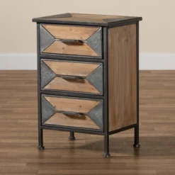 A contemporary take on industrial design, the Laurel end table enriches any space. Made in China, the Laurel is comprised of an antique gray finished metal frame combined with whitewashed oak finished wood and further enhanced with sleek, angular accents. Three drawers provide ample storage space for a variety of household essentials. Fully assembled, each drawer features a vintage style handle for easy access. An eye-catching accent that transforms any space, the Laurel end table is an exceptional addition to the modern home. Dimensions: 23.8″ High x 15.7″ Wide x 11.8″ Deep; Drawer: 5.7″ High x 13.2″ Wide x 10.4″ Deep; Legs: 3.7″ High;