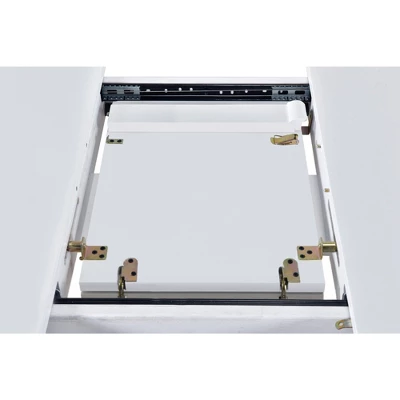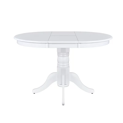 - Featured classic white finish, this dining table is anchored by a heavy pedestal with splayed feet which is designed to work in any decor.