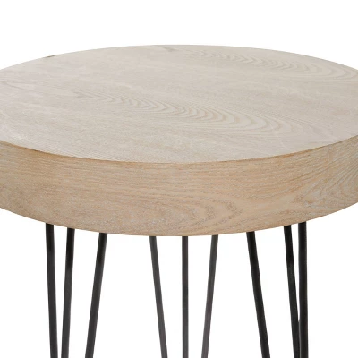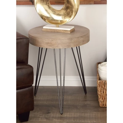 - •Brown accent table features a round top with natural wood graining and supported by three hairpin style legs