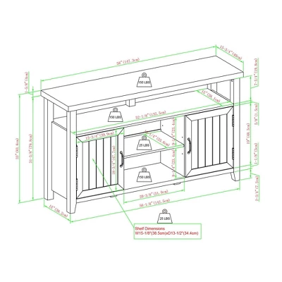 - Weight capacities: Top surface 150 lbs., upper shelf 150 lbs., center top and cabinet shelves, 25 lbs. Center bottom, 150 lbs.,