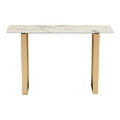 On-trend and decidedly modern, this beautiful console table will be on every designers list. Gorgeous from every angle, the rectangular faux marble top seems to float atop its simple gold geometric base. Long and narrow to fit in most spaces and is perfect for your entry, dining or living space. Pair with the Atlas coffee and end table.