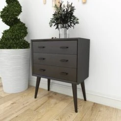 - Chest features 3 long rectangular drawer compartments with 6 minimalistic handles and splayed leg stands