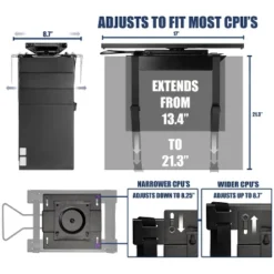 The MI-7154 is an under-desk computer mount with an adjustable frame that supports towers from 13.4″ to 21.3″ in height and 6.3″ to 8.7″ in width. It features a full, 360 swivel so that you can easily access the back of the tower. The CPU can slide up to 12.9″ in the mount for easier access. Clamps tightly on the top and bottom of your CPU to secure the tower. The heavy-duty design holds towers up to 22 lbs. It can also be mounted to a wall for even easier access. Save floor and desktop space, while keeping your computer within reach. Increase the life of your CPU by storing it off the floor and saving it from dirt and dust.