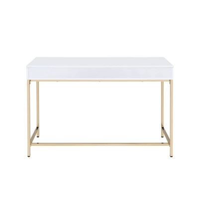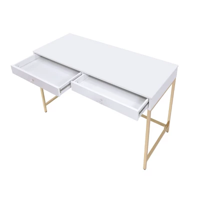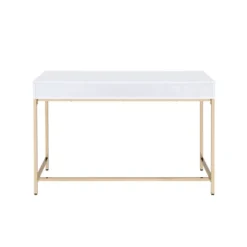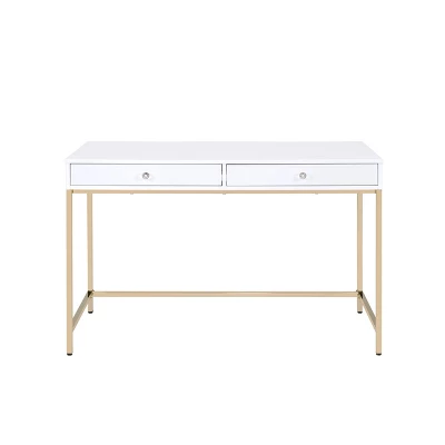 Motivation starts with a great office or study space. Enjoy the contemporary design of this Ottey office desk while getting all of your work done in style. Featuring white high gloss finish with a gold metal base, this practical yet fashionable desk offers ample surface room and 2 storage drawers for your office supplies or other accessories. Perfect for any office space in your home, this piece will offer you an excellent space to organize all of your work and study needs.