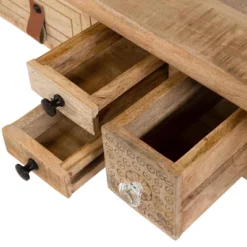 Explore your craft on this bohemian-style desk. The assorted drawer pulls and six different carved fronts make up a beautiful collage. Despite the vintage look from cabriole legs and an overhanging beveled tabletop, this desk comes from humble beginnings. The mango wood framework was harvested after serving its purpose on fruit farms. It can withstand much wear and tear, making this the perfect desk for a busy artist.