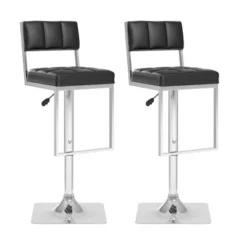 Modern style meets easy comfort with the Adjustable Square Tufted Leatherette Barstool Set from CorLiving. These two armless barstools keep things striking with the tufted square faux leather seat and square chrome base, while the gas lift adjustable seat and footrest keep you as comfortable as can be. Just add these modern barstools to your kitchen island or bar for an easy place to enjoy a sip.