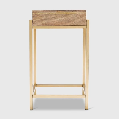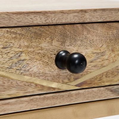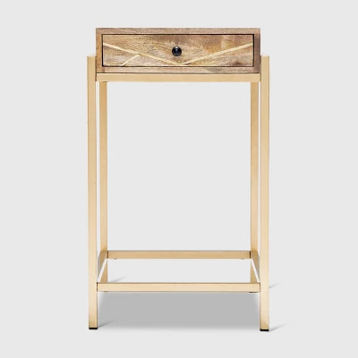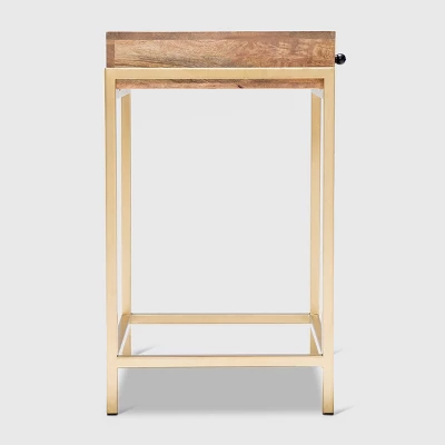 This slim yet sturdy solid mango wood end table is sure to be an eye-catcher. With two drawers for keeping items out of sight, the gold metal legs make this the perfect living room furniture set. Gold furniture never goes out of style and this globally-inspired piece is built to last. An accent table is an ideal addition to any type of decor and adds a lavish yet modern look to your living room. Pair with the matching console table for a furniture set that can be used in nearly every room.