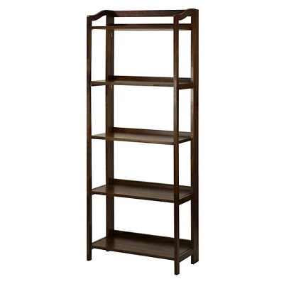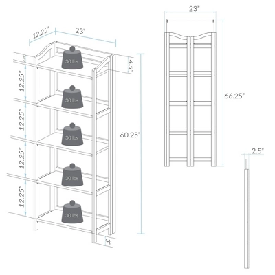 Regal curves and quaint simplicity define the transitional style of the 5-Shelf Folding Bookcase. Each shelf is spaced with ample room for your storage needs and decor. Foldable design means storage, transportation, and rearrangement are a breeze. Constructed from solid wood for lasting beauty. Assembly required. Wall mount hardware provided. Weight Capacity: 30 lbs. each shelf. Product dim: 23″W x 12.5″D x 60.25″H
