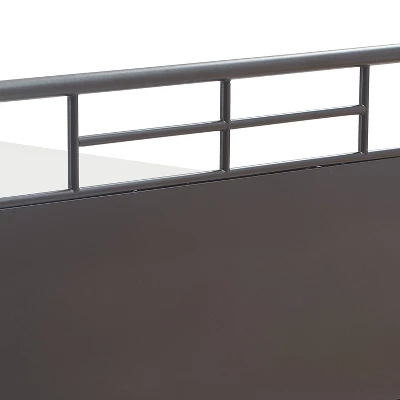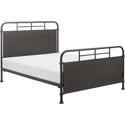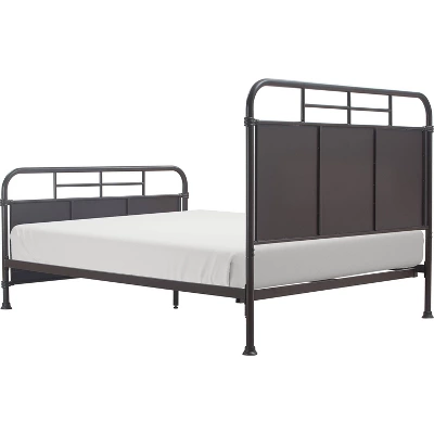 - Headboard and footboard feature industrial metal pipework