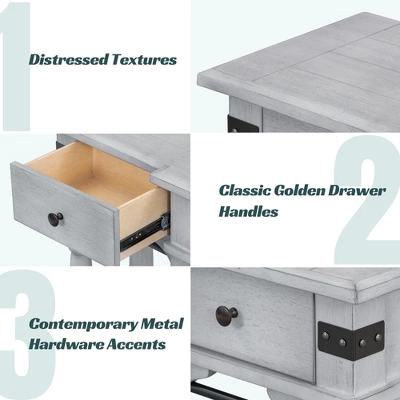 A retro-inspired console table that seamlessly blends vintage aesthetics with traditional charm. This piece is made of MDF and solid paper millet with glazed and dry-brushed finish. It showcases distressed textures, classic gold drawer handles, and modern metal hardware. This versatile table can easily add rustic charm and vintage elegance to any room decor. It can be used as a dresser, console table or coffee table to add sophistication to your home.