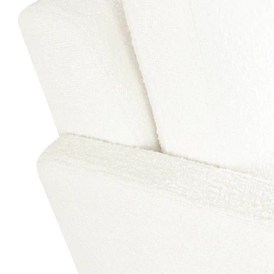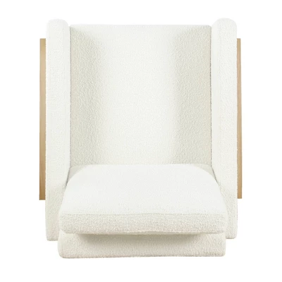 Bring a touch of modern aesthetic and comfortable seating to your living room or office with this exposed natural finish wood frame armchair. The chair features comfortable box cushions in a durable cream boucle fabric. Simple yet beautiful, the modern accent chair is the perfect addition to any decor style. Spot Clean only. Assembly required